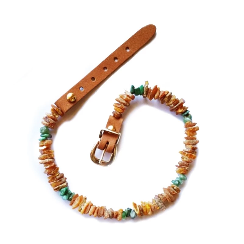I collari sono realizzati in ambra naturale GREZZA e sono dotati di comodo CINTURINO REGOLABILE IN CUOIO..