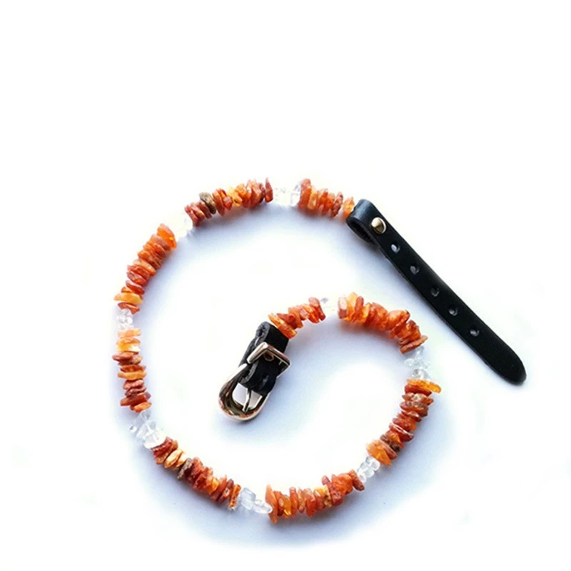 I collari sono realizzati in ambra naturale GREZZA e sono dotati di comodo CINTURINO REGOLABILE IN CUOIO..