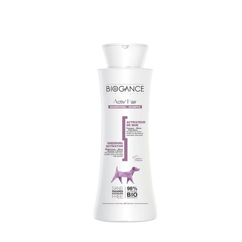 Shampoo Attivatore per la perdita di pelo, formulato con Petit Holly, Crescione e Maca per attivare la microcircolazione sanguigna e migliorare l’ossigenazione del pelo del tuo animale domestico, accelerando così la muta.