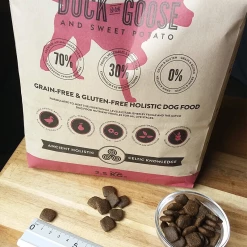 Anatra e oca (70% di cui: 35% anatra appena preparata, 21% anatra secca, 8% oca appena preparata, 5% grasso d’anatra, 1% sugo d’anatra) patata dolce (22%), erba medica, semi di lino, piselli, alghe (schizochytrium limacinum), vitamine e minerali, mannanoligosaccaridi (Bio-MOS), fruttoligosaccaridi (FOS), cloruro di colina, condroitina solfato (1.500 mg/kg), metilsulfonilmetano (MSM) (1.500 mg/kg), glucosamina (700 mg/kg), mirtilli rossi secchi (600 mg/kg), rosmarino, dente di leone, bacche di ginepro, radice di liquirizia (400 mg/kg), radice di angelica, rosa canina, camomilla (300 mg/kg), bardana, ortica, anice e fieno greco, foglie di menta, fiori di calendula, radice di altea, finocchio, estratto di yucca schidigera (250 mg/kg), foglia di carciofo (200 mg/kg), alga secca, cannella (100 mg/kg), mele, carote, zucca (100 mg/kg), pere, spinaci.
