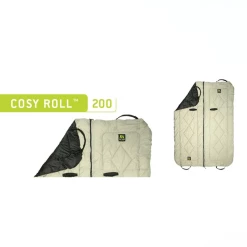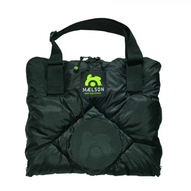 Soluzione ingegnosa per trasportare gli accessori del cane; apribile mediante chiusure lampo per trasformarsi in una coperta isolante.