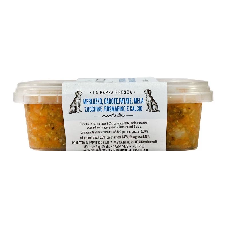 COMPOSIZIONE : Merluzzo 60%, carota, patata, mela, zucchina, acqua di cottura, rosmarino, carbonato di calcio