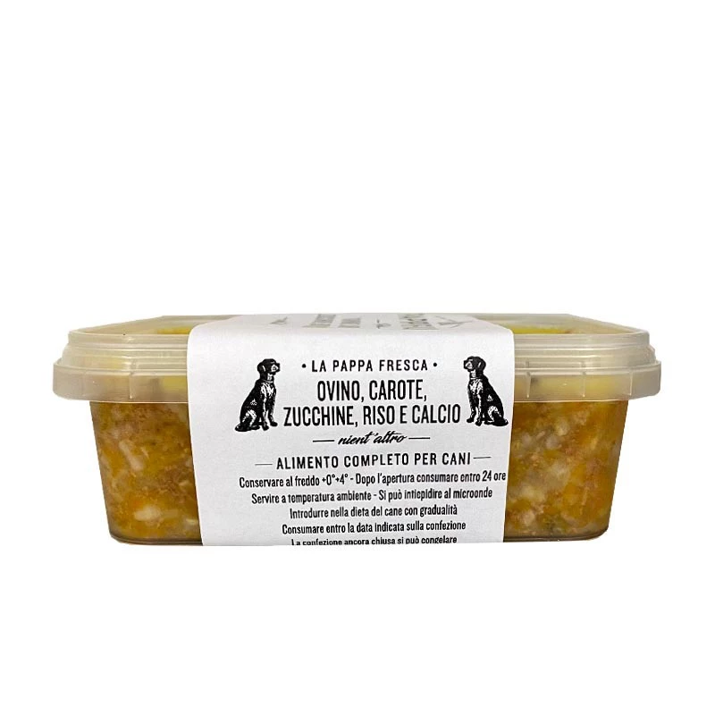 COMPOSIZIONE : Carne di ovino 40%, carota, zucchina, acqua di cottura, riso integrale, carbonato di calcio.