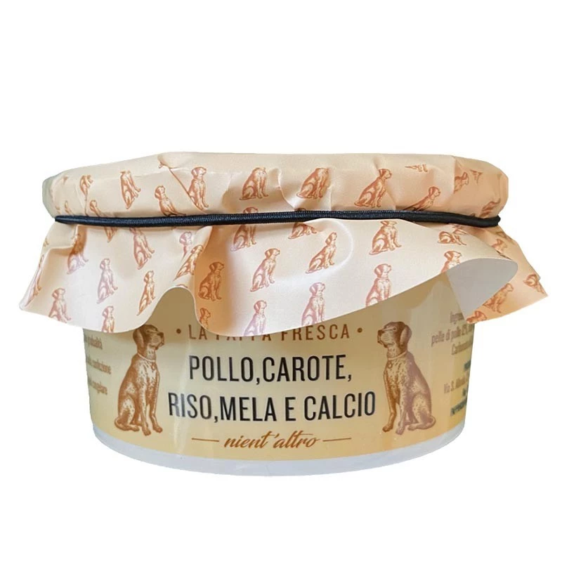 COMPOSIZIONE : Carne di Pollo 51%, Mela 14%, Carota 14%, Pelle di Pollo 12%, Riso 4,97%, Fegato di Pollo 2%, Cuore di Pollo 2%, Carbonato di calcio 0,03% (di cui calcio 0,012%).