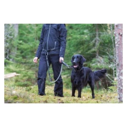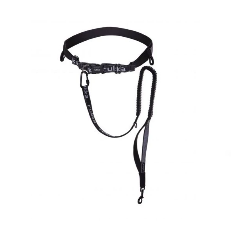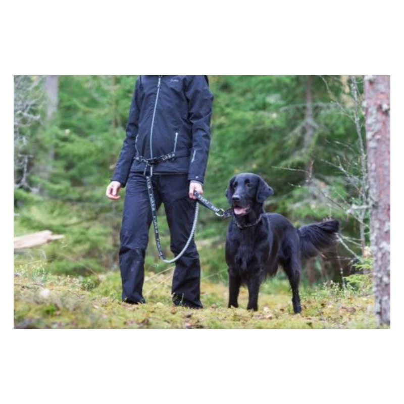 Il guinzaglio ha una molla elastica che permette di attutire eventuali strattoni da parte del cane ed evita così di far cadere chi sta indossando la cintura.