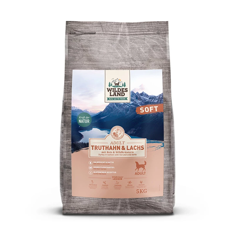 La prelibata carne di Tacchino e Salmone viene affinata con verdure ed erbe selvatiche.